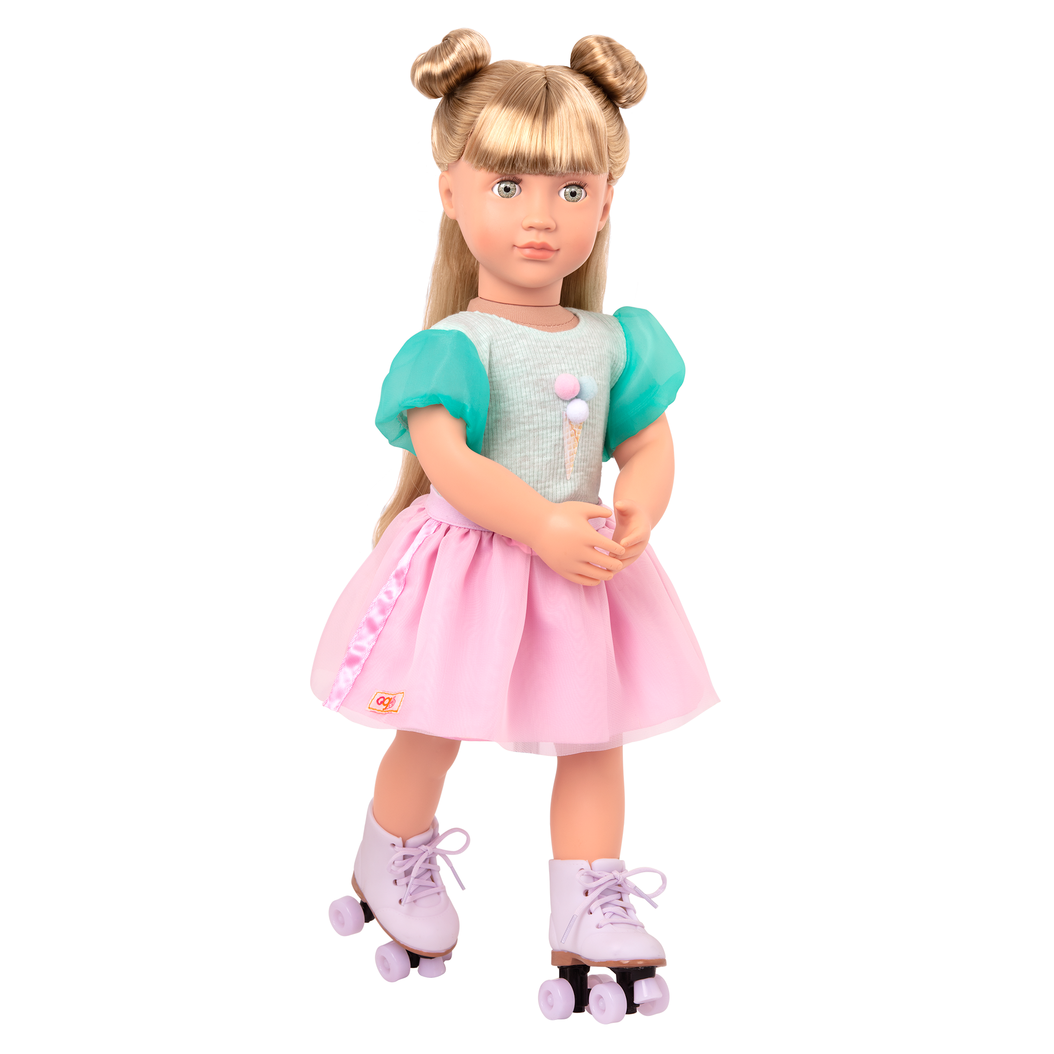 One scoop fashion, two scoops fun! The Our Generation Scoopalicious ice cream outfit for 18-inch dolls features easy-open closures that make it quick to put on and remove. Dress your bestie in the colorful top with a decorative ice cream embroidery and pom pom scoops, then add the bright pink ruffle skirt to complete the look. Don't forget the pink roller skates! They add an extra touch of fun to your doll's fashion wardrobe, and they can also be paired with many Our Generation clothing sets, so your dolls can roll around the neighborhood in the cutest colors! (Dolls sold separately)