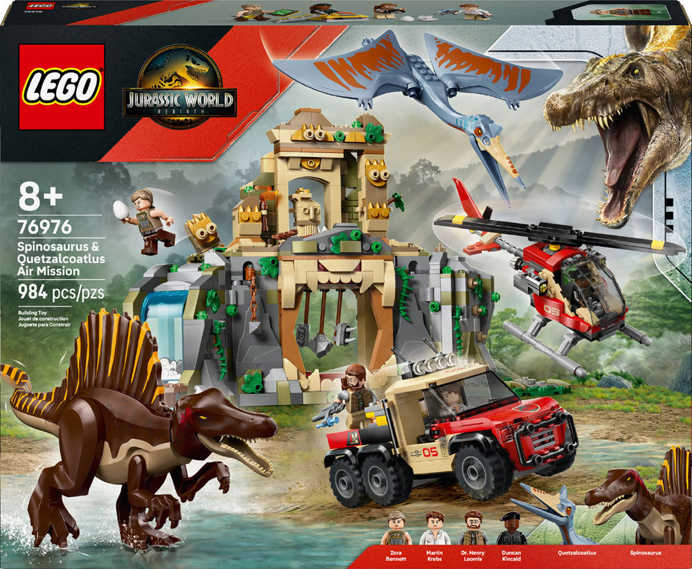 Double the dinosaurs, double the danger! The LEGO Jurassic World Spinosaurus & Quetzalcoatlus Air Mission (76976) introduces young paleontologists ages 8+ to two of Jurassic World Rebirth's most formidable prehistoric creatures. Children can build the fearsome Spinosaurus with posable legs, arms, tail, head, and jaw, alongside the magnificent Quetzalcoatlus with movable wings and jaw ready for aerial attacks. The adventure continues with an ancient temple featuring collapsing columns, a waterfall entrance that opens, and a trap with falling axes triggered by pulling a chain. Young explorers will love playing with the four included minifigures - Martin Krebs, Zora Bennett, Duncan Kincaid, and Dr. Henry Loomis - equipped with a helicopter, truck, and research tools for their dangerous mission. Perfect as a birthday or any-time gift for young boys and girls who love dinosaurs and pretend play, this set creates endless possibilities for epic prehistoric encounters. The LEGO Builder app enhances the building experience with intuitive 3D instructions. Contains 984 pieces.