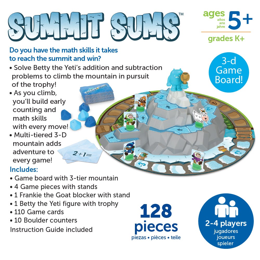 Do you have the math skills it takes to reach the summit? Kids solve addition and subtraction problems as they race their way up the multi-tiered 3-D mountain. Watch out for Frankie the Goat—he will block your path and put you behind the winning pace. Reach Betty the Yeti first to claim the trophy!