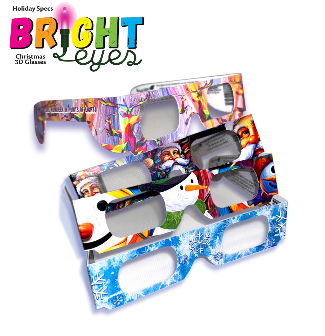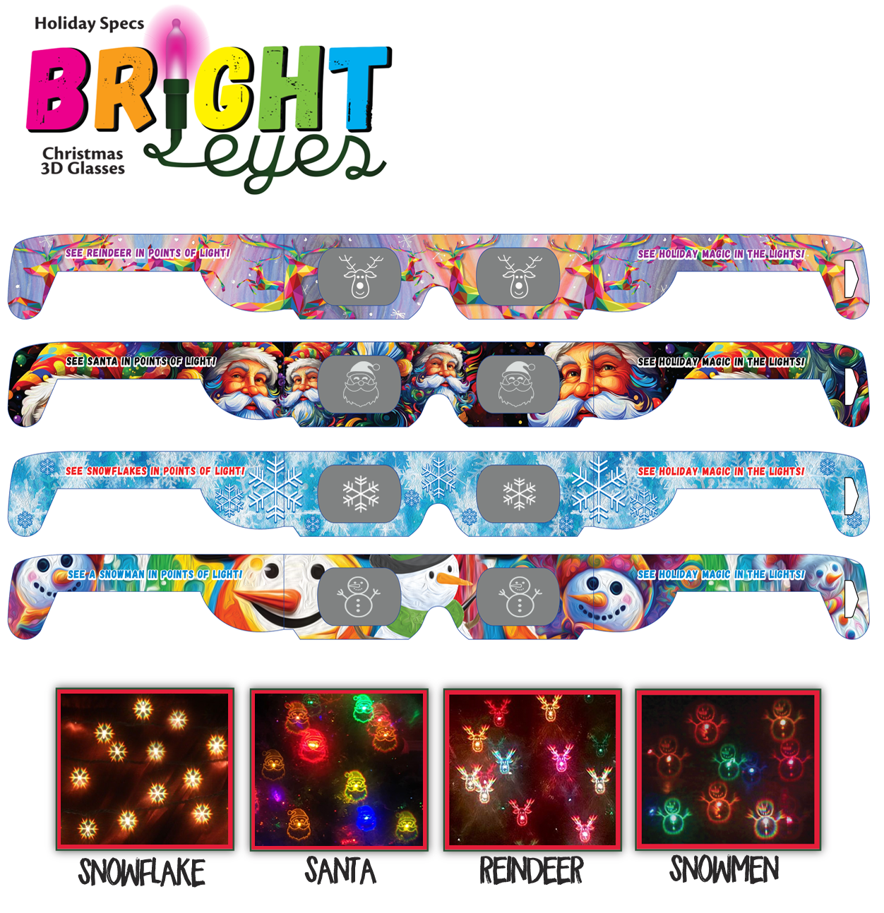 Want to stand out this season? Give something unique and cool? Make people happy? Look No Further! Introducing our brand new ''Bright Eyes'' Christmas 3D Glasses 4 pack. We took our most popular lenses, re-imagined the frames, and bundled everything together to make one complete Christmas 4 pack. Voila! With over 100 million sold around the globe, our Bright Eyes 3D Glasses miraculously transform Christmas lights into magical holiday images (Snowflake, Snowman, Reindeer, and Santa)!The ultimate solution to all your holiday woes from the office party to unavoidable family commitments, Bright Eyes 3D Glasses are sure to bring every last bit of the merry and bright back into your holiday obligations. With multiple gifts to give, parties to attend, and stockings to stuff, make life simple and give the people what they really want. Pure joy!