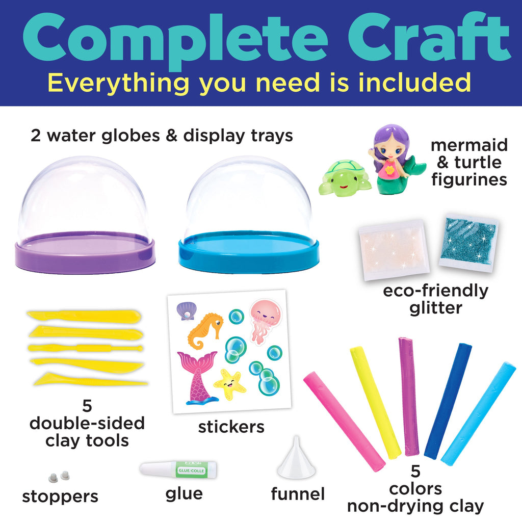 Contents Include: 2 acrylic water globes, 5 sticks of modeling clay- blue, aqua, neon pink, neon yellow and neon violet, set of clay tools, plastic funnel, clear vac trays, eco friendly crystaline glitter, Mermaid and Turtle figurines, extra stoppers, clear special paint, 4c sticker sheet, instructions