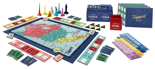 Made by the game makers who brought you Things, Tripped is a fast-paced light strategy game that everyone can play. Leave home, race to 6 other cities and get back first! Travel by road for free or collect tickets to board trains, ships, and planes. To win, you'll have to plan the best route, gather the right number of tickets and use the Tripped Cards to your advantage. But you'll still get Tripped - it's the name of the game!