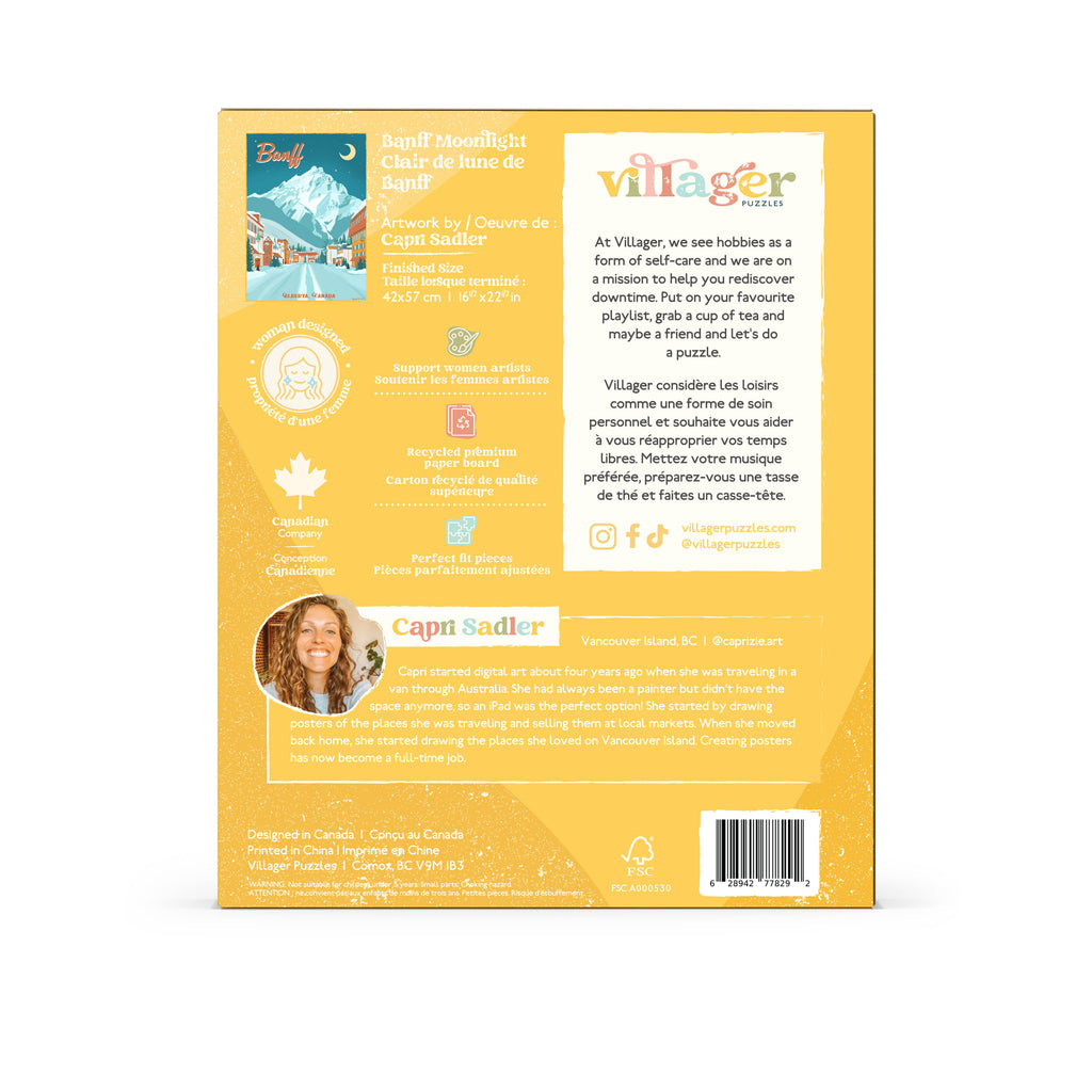 This beautifully-illustrated travel poster style puzzle of Banff, Alberta shows the town and mountains at night. Pairs with winter and outdoors themed decor, prints and gifts. Designed by Canadian artist and nature lover, Capri Sadler. Style is modern retro.