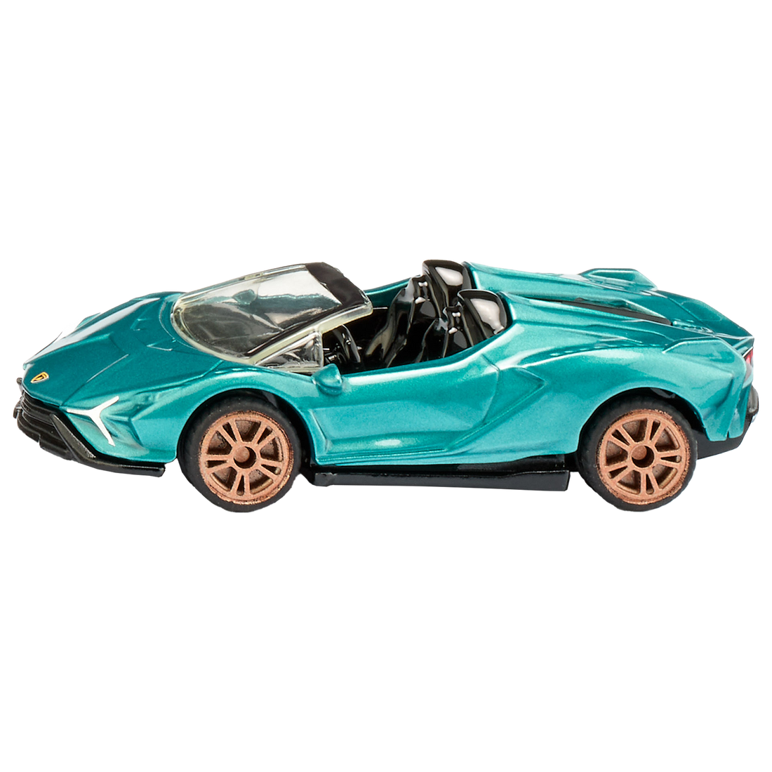 The Sián Roadster is Lamborghini's first super-sports hybrid convertible, featuring the world's first super-capacitor hybrid technology, and made from material combinations that are unique to date. There's no doubt about it: it's a must-have for any toy car fleet! However, the rest of the Sián Roadster model is a perfect match for the original sports car: with its sturdy metal body and cool arrow shape, it is a perfect reproduction of the original and takes up its bright metallic turquoise. The chassis and interior are in black plastic and are perfectly visible through the open roof. The typical Y-shaped headlights are printed like the originals, as are the taillights.