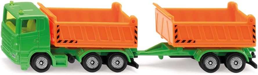 Rubble, soil, gravel or sand – the HGVs with tipper are the all-rounders on every construction site. Powered by a strong motor, the tipper pulls a tipping trailer with tandem axle. The tippers can be loaded using the SIKU excavators and wheeled loaders. A toot of the horn and the sturdy vehicles of metal and plastic parts pull off slowly. Having arrived at the unloading site, the tippers can be tipped up and the trailers uncoupled to be unloaded at a second location. The tailgates of the tippers also open.