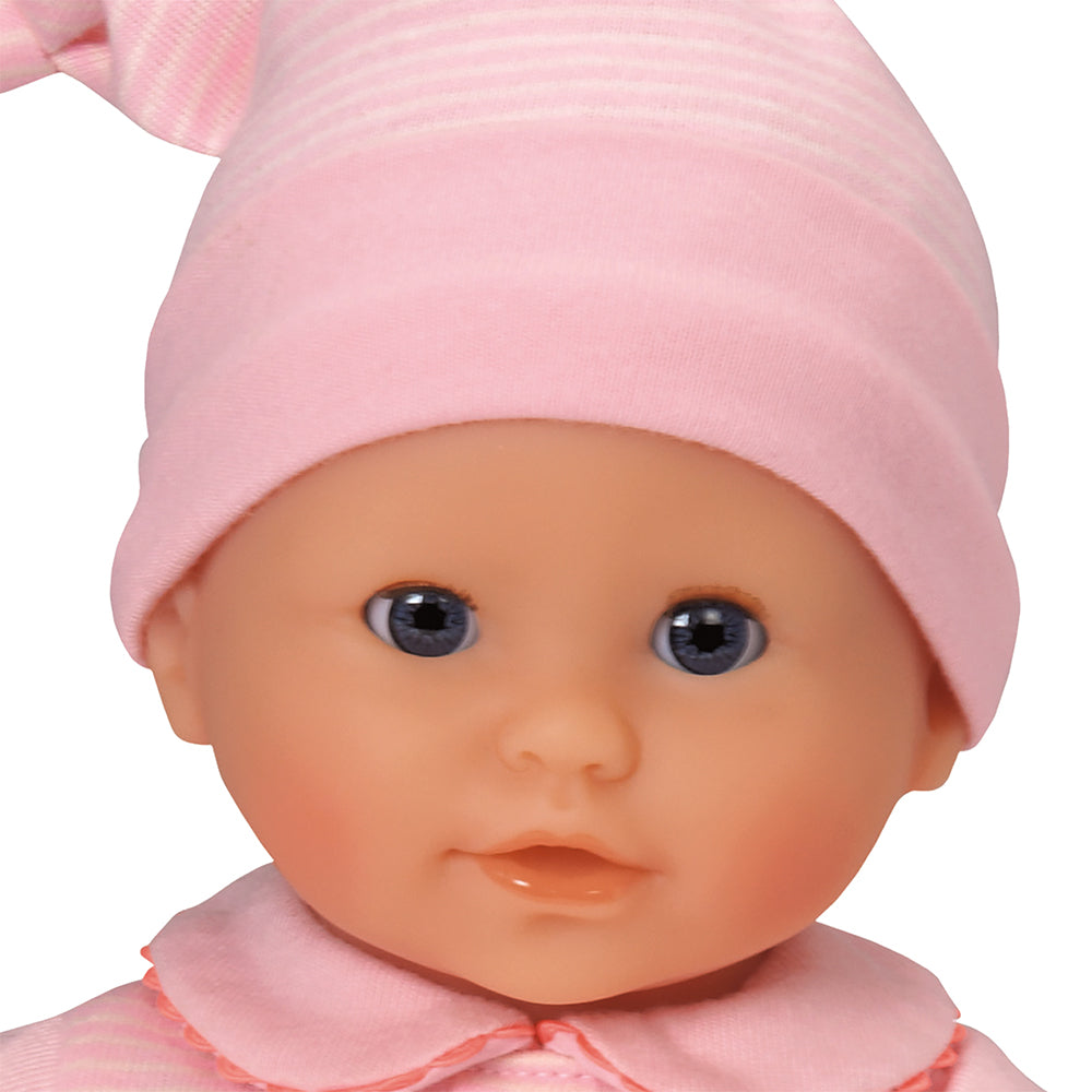 The doll's head, arms and legs are made of soft-to-the-touch vinyl that is delicately scented with vanilla, a Corolle signature. Charming has eyes that close when it's put down for a nap or at bedtime and is dressed in pink pajamas and wears a matching hat.