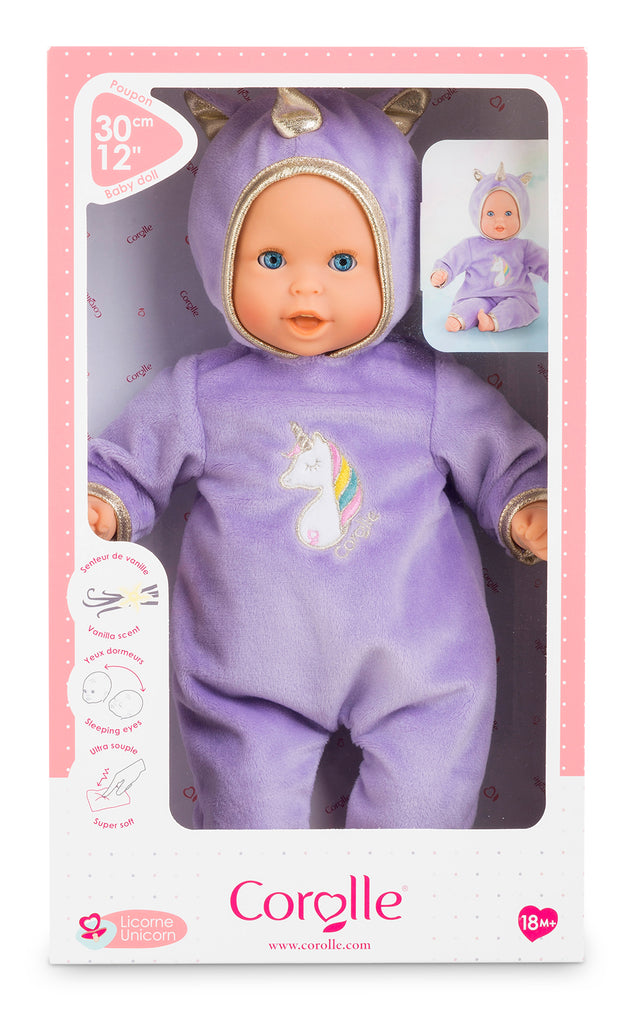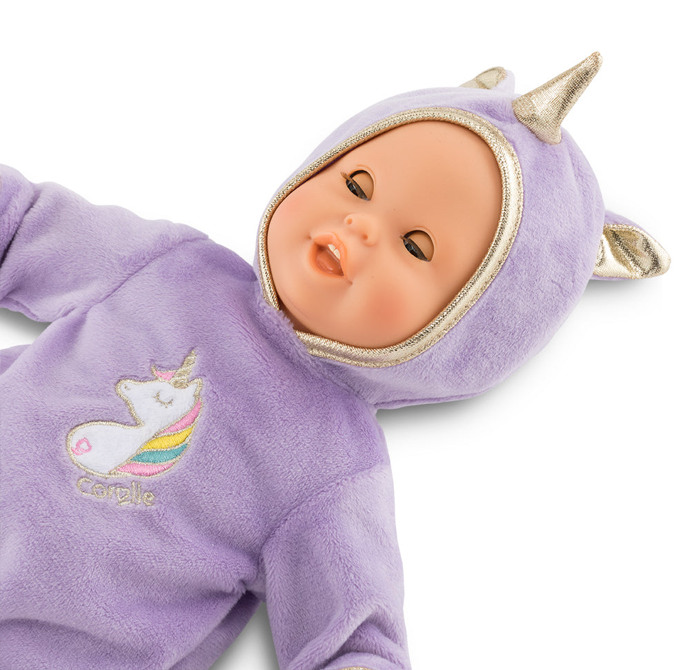 The doll's head, arms and legs are made of soft-to-the-touch vinyl that is delicately scented with vanilla, a Corolle signature.  She is dressed in a purple onesie featuring unicorn embroidery and a hood with a gold horn and two little ears.