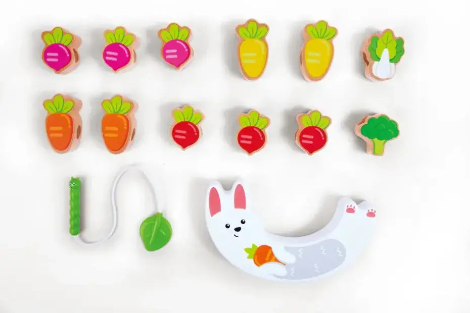 Introduce little hands to joyous play with this adorable bunny-themed toy that blends stacking and threading fun. Children can balance colourful wooden vegetables on the bunny’s head and thread them together using a charming caterpillar rope—perfect for developing fine motor control and coordination with every giggle-inducing wobble.