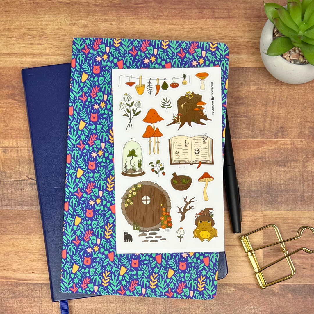 Peek inside the Curious Cottage and discover a world of cozy charm and woodland wonder. This sticker sheet is filled with autumn details and tiny treasures that make every corner feel like home. It’s the perfect mix of storybook whimsy and cottagecore comfort. Sheet design created exclusively by Four Bears Sticker Club, featuring curated artwork licensed for our use — you won’t find this combination anywhere else! Details: * One sheet: 90x150 mm * Clear PET stickers on a clear backing * Printed solely for Four Bears Sticker Club