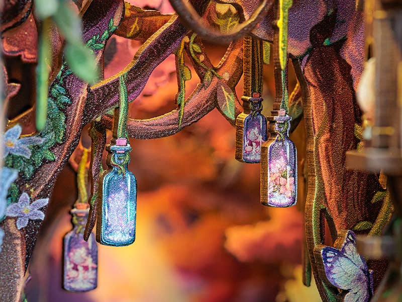BookNooks are incredibly detailed miniature scenes that you build yourself, then fit perfectly into your bookshelf.  These kits are for ages 14+ and may take up to 7hrs. to complete.  Perfect for a teen or grownup!  (please don't buy this for an 8 yr old...)  They each include lights that illuminate the scene and include pieces made from wood, paper & metal.  Requires glue & AAA batteries x 2