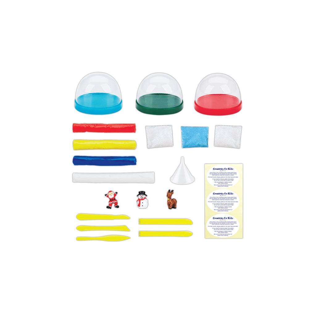Holiday craft kit comes with everything you need to make 3 festive snow globes! Includes glitter, resin figures, non-drying clay, plastic tools, plastic funnel, plastic snow globes, stickers, cold silicone glue and clear vac trays